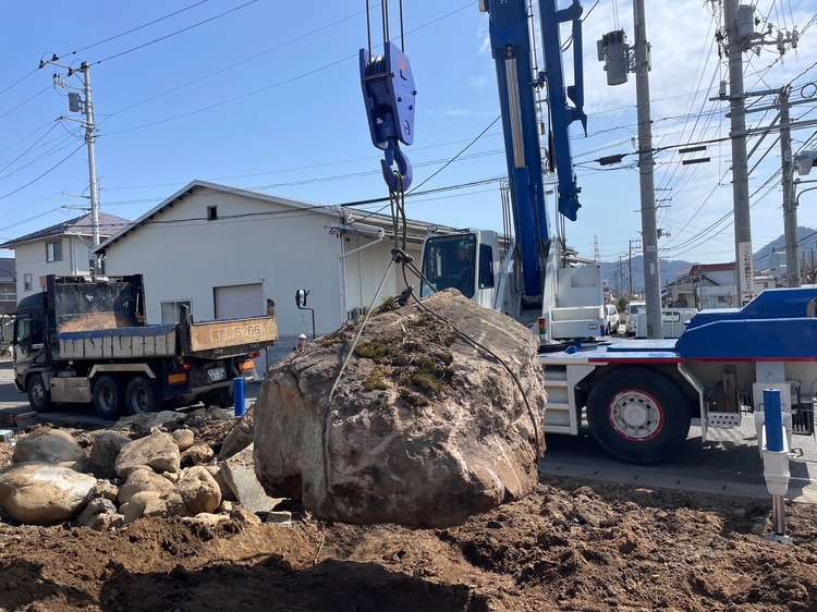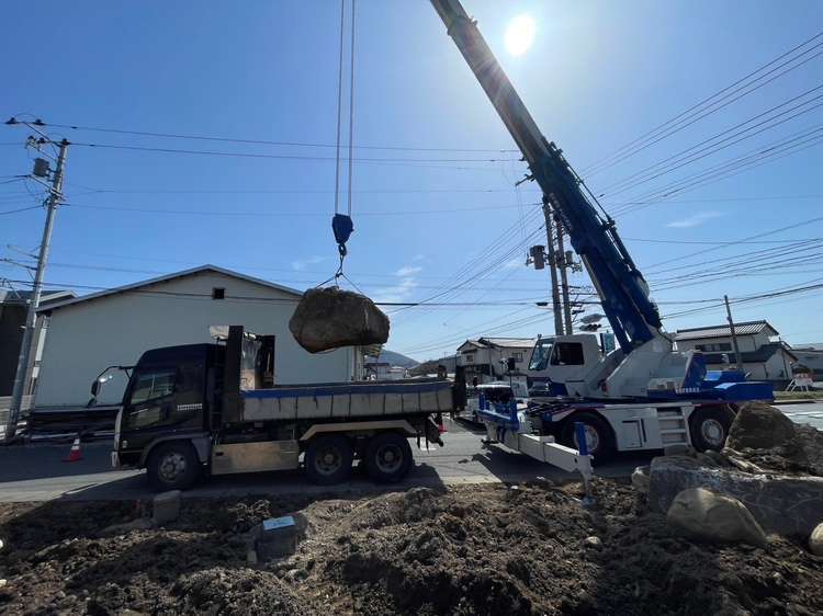 付帯工事では、とても大きな庭石が有りましたので、安全面も考慮して、35tラフタークレーンで吊って大型ダンプを使用しての搬出を選択しました。